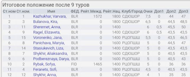 После безмедального выступления в старших возрастах сейчас порадовали девочки, взявшие золото и серебро. Первое место у Варвары Кожухарь (тренеры - Т. Бондарь, В. Каташук), второе - у Киры Булановой (тренер - В. Каташук). Надо отметить, что обе ездят на тренировки из пригородов, это показывает их стремление заниматься. Бронза у Анны Шеремет, занимающейся во дворце молодежи (тренер - А. Королев). Полная таблица - https://s2.chess-results.com/tnr1361171.aspx?lan=11&art=1&rd=9&SNode=S0.